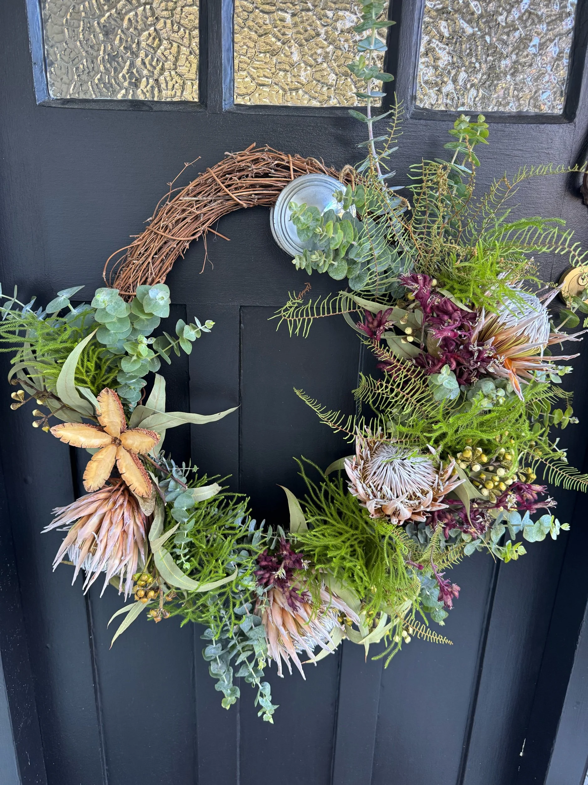 This stunning one of a kind wreath is 40-50cm and is a mix of fresh and dried flowers/foliage.