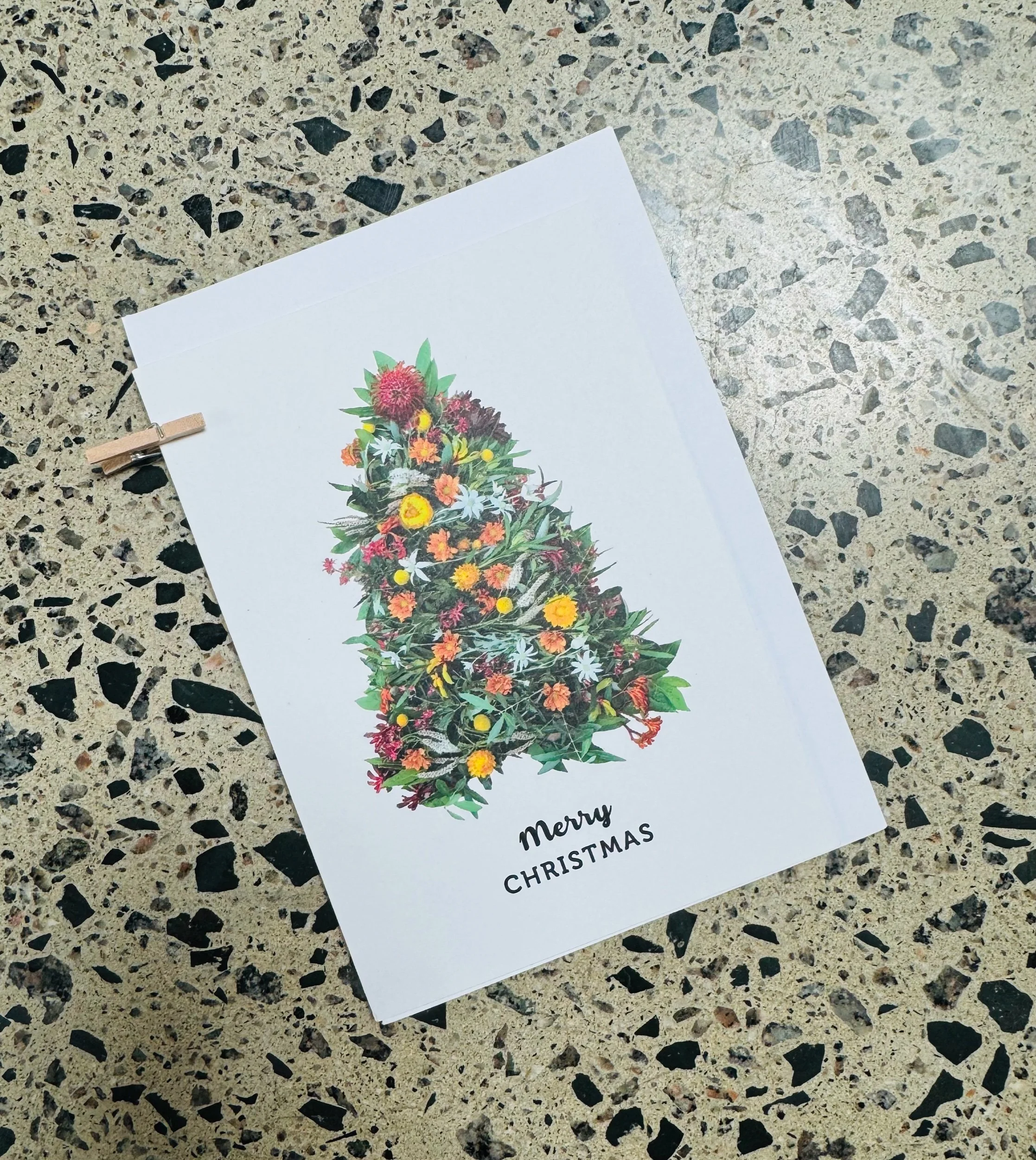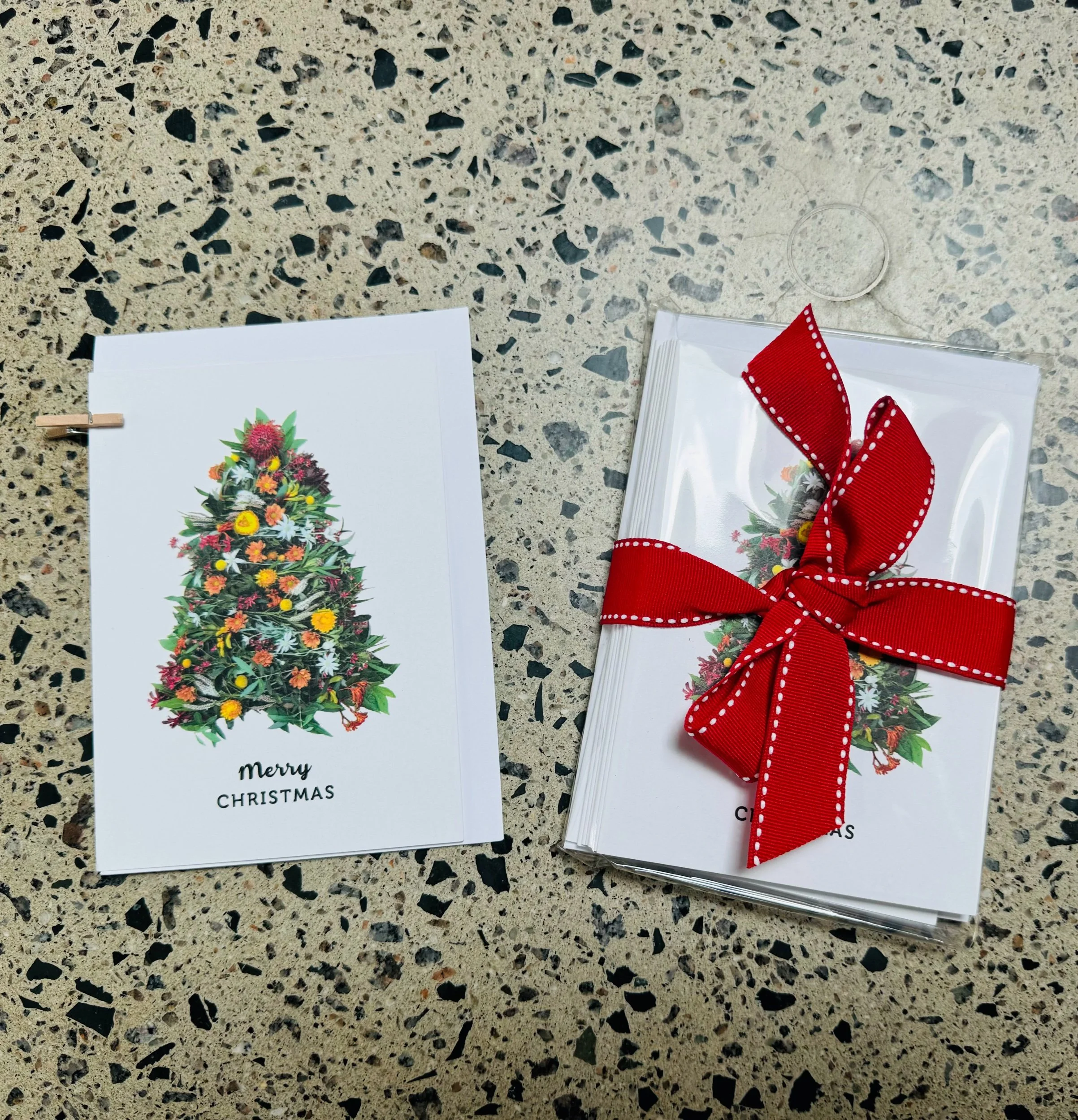 Our Christmas Cards all have our Christmas Tree photo design on the front (made from foliage and flowers) , each card is blank in the middle for you to write your own message.